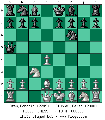 Last move : 1-0 2025 July 10 5:10:13 [Event "FICGS__CHESS__RAPID_A__000309"] [Site "FICGS"] [Date "2025.05.25"] [Round "1"] [White "Ozen,Bahadir"] [Black "Stubbel,Peter"] [Result "1-0"] [WhiteElo "2249"] [BlackElo "2000"] 1.d4 Nf6 2.c4 d5 3.cxd5 Qxd5 4.Nc3 Qa5 5.Bd2 Qb6 6.Qc2 1-0 This chess game has been lost on time (started : 2025.05.25 23:28:30) Follow this game move after move (download)The tactician knows what to do when there is something to do; whereas the strategian knows what to do when there is nothing to do. (Gerald Abrahams) Gewöhnliche Menschen denken nur daran, wie sie ihre Zeit verbringen. Ein intelligenter Mensch versucht, sie auszunutzen. (Arthur Schopenhauer) Ayuda a tus piezas para que ellas te puedan ayudar. (Paul Morphy) Le thème de l'attaque double intervient d'une manière ou d'une autre dans l'immense majorité des combinaisons. (Youri Averbakh) An expert is a man who has made all the mistakes which can be made in a very narrow field. (Niels Bohr)