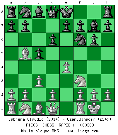 Last move : 1/2-1/2 2025 July 27 0:41:29 [Event "FICGS__CHESS__RAPID_A__000309"] [Site "FICGS"] [Date "2025.05.25"] [Round "1"] [White "Cabrera,Claudio"] [Black "Ozen,Bahadir"] [Result "1/2-1/2"] [WhiteElo "2014"] [BlackElo "2249"] 1.e4 c5 2.Nf3 d6 3.c3 Nf6 4.Be2 g6 5.O-O Bg7 6.Bb5+ Nc6 7.Re1 O-O 8.h3 Bd7 9.a4 a6 10.Bc4 Na5 11.Bf1 e5 12.d3 Nc6 13.Na3 b5 14.Nc2 Qb6 15.b4 cxb4 16.axb5 axb5 17.Rxa8 Rxa8 18.Nxb4 Nxb4 19.cxb4 Ra1 20.Qc2 Qc6 1/2-1/2 Follow this game move after move (download)Chess is really ninety nine percent calculation. (Soltis) Obwohl ich vom Stil her kaum zu den Priestern der Schachkunst gezählt werde, halte ich Schach doch für eine Kunst. (Tigran Petrosjan) Una buena ofensiva y una buena defensa, comienzan ambas con un buen desarrollo. (Bruce A. Moon) Des idées, des idées, j'en ai cent, j'en ai mille. Des bonnes, des mauvaises, applicables, irréalisables... Il suffit de faire le tri ! (Roos) Experiences are the keys to life. (Daniel Parmet)