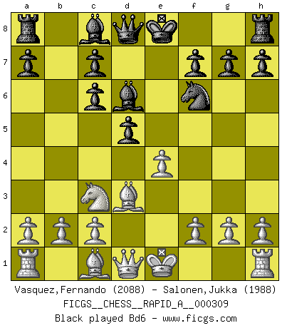 Last move : 1-0 2025 September 25 7:6:39 [Event "FICGS__CHESS__RAPID_A__000309"] [Site "FICGS"] [Date "2025.05.25"] [Round "1"] [White "Vasquez,Fernando"] [Black "Salonen,Jukka"] [Result "1-0"] [WhiteElo "2088"] [BlackElo "1988"] 1.e4 e5 2.Nf3 Nc6 3.d4 exd4 4.Nxd4 Nf6 5.Nxc6 bxc6 6.Bd3 d5 7.Nc3 Bd6 8.h3 O-O 9.O-O Re8 10.Re1 d4 11.Na4 c5 12.e5 Rxe5 13.Rxe5 Bxe5 14.Qf3 Rb8 15.Nxc5 Qe7 16.b4 a5 17.a3 Bd6 18.Bf4 Bxc5 19.bxc5 Qxc5 20.Re1 Bd7 21.Re5 Qc3 22.Kh2 Bc6 23.Qg3 g6 24.Qg5 Nd7 25.Re7 Qc5 26.Qh4 Ba4 27.Bg5 Qd6+ 28.f4 Nb6 29.Bf6 Nd5 30.Bxg6 Nxf6 31.Bxf7+ Kh8 32.Re6 Qd8 33.Rxf6 Bxc2 34.Be6 Qe7 35.Qg5 d3 36.Qe5 Qg7 37.Bf5 Bb3 38.Bxd3 Bg8 39.Be4 a4 40.h4 Rb6 41.Bc6 Rb3 42.g4 Re3 43.Qxe3 Qxf6 44.Qe5 Qxe5 45.fxe5 Bb3 46.Kg3 h6 47.Kf4 Kg7 48.g5 Be6 49.gxh6+ Kxh6 50.Bxa4 c5 51.Bc2 Kg7 52.a4 Bd7 53.h5 Bh3 54.Kg5 1-0 Follow this game move after move (download)A man without frontiers. He didn't divide the East and the West, he brought them together in their admiration for him. (Ljubomir Ljubojevic, about Bobby Fischer's death) Ich organisiere ein großes Turnier, was mich etwa 120000 Dollar kostet. Ich denke, das ist das erste Mal in der Schachgeschichte, daß ein Schachgroßmeister auch als Mäzen auftritt. (Miguel Najdorf) El tablero es el mundo, las piezas es el fenomeno del universo, las reglas del juego son lo que llamamos leyes de la naturaleza y el jugador del lado opuesto, se encuentra oculto a nuestra vista. (Thomas Huxley) J'ai toujours senti une vague pitié pour l'homme qui ne connaît rien aux échecs, tout comme j'en aurais pour un homme ignorant de l'amour. Les Echecs, comme la musique ou comme l'amour, ont le pouvoir de rendre heureux. (Siegbert Tarrasch) Chess is as much a mystery as women. (Purdy)