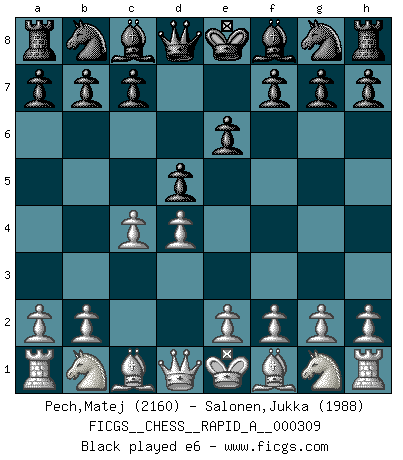 Last move : 1-0 2025 September 27 8:35:26 [Event "FICGS__CHESS__RAPID_A__000309"] [Site "FICGS"] [Date "2025.05.25"] [Round "1"] [White "Pech,Matej"] [Black "Salonen,Jukka"] [Result "1-0"] [WhiteElo "2160"] [BlackElo "1988"] 1.d4 d5 2.c4 e6 3.Nc3 Nf6 4.Nf3 Be7 5.Bf4 O-O 6.e3 Nbd7 7.c5 c6 8.h3 b6 9.b4 a5 10.a3 Ne4 11.Nxe4 dxe4 12.Ne5 Nxe5 13.Bxe5 f6 14.Bg3 Qd5 15.Be2 Ba6 16.O-O axb4 17.axb4 Bxe2 18.Qxe2 b5 19.Rfc1 Rfd8 20.Kh2 Kf7 21.h4 Rf8 22.Ra5 Rxa5 23.bxa5 Ra8 24.Ra1 Ra6 25.Bc7 g6 26.g4 f5 27.g5 e5 28.dxe5 Bxc5 29.Rd1 Qe6 30.h5 Be7 31.Qb2 gxh5 32.Rd6 Bxd6 33.exd6 Ra8 34.d7 Qxd7 35.Qf6+ Kg8 36.Be5 Rf8 37.Qh8+ Kf7 38.Qxh7+ Ke8 39.Qg6+ Kd8 40.a6 Kc8 41.Bf4 b4 42.Qh6 Rg8 43.Qf6 Re8 44.Kh3 b3 45.g6 h4 46.g7 Rg8 47.Qf8+ Qe8 48.Qd6 Rxg7 49.Qb8+ Kd7 50.Qb7+ Ke6 51.Qxg7 Qd7 52.Qxd7+ Kxd7 53.Be5 Kc8 54.Kxh4 c5 55.Kg5 b2 56.Bxb2 Kc7 57.Kxf5 1-0 Follow this game move after move (download)All I want to do, ever, is just play Chess. (Bobby Fischer) Ich habe die Schachforschung dermaßen betrieben, dass sie auf eine wissenschaftliche Basis gestellt wurde. (Mikhail Moiseyevich Botvinik) El hombre es un frívolo, una creatura engañosa y como un jugador de Ajedrez, se preocupa mas por el proceso de obtener su meta que de la meta por sí misma. (Dostoyevsky) La menace est plus forte que l'exécution. (Aaron Nimzovitch) Creativity involves breaking out of established patterns in order to look at things in a different way. (Edward De Bono)