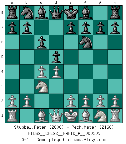 Last move : 0-1 2025 July 15 16:2:10 [Event "FICGS__CHESS__RAPID_A__000309"] [Site "FICGS"] [Date "2025.05.25"] [Round "1"] [White "Stubbel,Peter"] [Black "Pech,Matej"] [Result "0-1"] [WhiteElo "2000"] [BlackElo "2160"] 1.d4 d5 2.c4 c6 3.Nc3 Nf6 0-1 This chess game has been lost on time (started : 2025.05.25 23:28:30) Follow this game move after move (download)Chess is a terrible game. If you have no center, your opponent has a freer position. If you do have a center, then you really have something to worry about ! (Siegbert Tarrasch) Pläne sind die Träume des Verständigen. (Ernst Freiherr von Feuchtersleben) El estómago es una parte esencial del maestro de Ajedrez. (Bent Larsen) Le joueur d'Echecs qui veut atteindre le top est obligé de développer son propre credo créatif. Alexeï Stepanovicth Souétine. Il est facile d'écrire des livres ! Ce qui est difficile, c'est de jouer ! (Alexeï Stepanovicth Souétine) I fear not the man who has practiced 10,000 kicks once, but I fear the man who has practiced one kick 10,000 times. (Bruce Lee)
