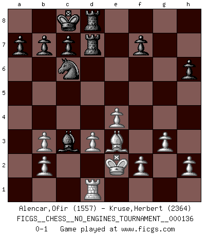 Last move : 0-1 2025 June 17 13:52:36 [Event "FICGS__CHESS__NO_ENGINES_TOURNAMENT__000136"] [Site "FICGS"] [Date "2025.05.27"] [Round "1"] [White "Alencar,Ofir"] [Black "Kruse,Herbert"] [Result "0-1"] [WhiteElo "1557"] [BlackElo "2364"] 1.c4 g6 2.Nc3 Bg7 3.g3 d6 4.Bg2 e5 5.Bh3 Bxh3 6.Nxh3 Nc6 7.Nd5 Nf6 8.Nxf6+ Qxf6 9.d3 h6 10.Be3 g5 11.Rb1 Qe6 12.Ng1 d5 13.cxd5 Qxd5 14.Nf3 g4 15.Qb3 Qxb3 16.axb3 gxf3 17.exf3 O-O-O 18.Ke2 Rd5 19.Rbc1 Rhd8 20.Rc3 R5d7 21.Rd1 e4 22.fxe4 Bxc3 0-1 Follow this game move after move (download)Nothing excites jaded Grandmasters more than a theoretical novelty. (Dominic Lawson) Es gibt zwei Arten von Opfern: Korrekte und meine. (Mikhail Nekhemyevich Tal) Los Peones son el alma de una partida de Ajedrez. (Francois Andre Danican Philidor) Les réformistes prétendent que les progrès de la théorie conduiront à la disparition des échecs, et qu'il faut, pour leur rendre vie, en remanier les règles. En réalité, qu'exprime cette affirmation? Le mépris de l'intuition, de l'imagination et de tous les autres éléments qui font des échecs un art. (Alexander Alekhine) The only thing that overcomes hard luck is hard work. (Harry Golden)
