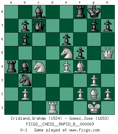 Last move : 0-1 2007 December 1 20:3:37 [Event "FICGS__CHESS__RAPID_B__000069"] [Site "FICGS"] [Date "2007.10.02"] [Round "1"] [White "Cridland,Graham"] [Black "Gomez,Jose"] [Result "0-1"] [WhiteElo "1524"] [BlackElo "1653"] 1.d4 Nf6 2.c4 Nc6 3.g3 d5 4.Bg2 e6 5.Nf3 dxc4 6.O-O Nd5 7.a4 Bb4 8.Na3 Na5 9.Ne5 Nb6 10.e3 c5 11.Qg4 O-O 12.dxc5 Nb3 13.cxb6 Nxa1 14.Naxc4 f5 15.Qh5 axb6 16.Rd1 Qc7 17.e4 Rxa4 18.Bf4 Nb3 0-1 This chess game has been lost on time (started : 2007.10.02 22:29:26) Kevitz-Trajkovich defense Kingside Castling by player White (move 6) Kingside Castling by player Black (move 11) Player Black won this chess game. Follow this game move after move (download)Nowadays, when you're not a grandmaster at 14, you can forget about it. (Anand Viswanathan) Ich erzeugte keinen Neid, da mich die Schachspieler als Musiker und die Musiker als Schachspieler betrachteten. (Mark Taimanov) Me gusta decir que Bobby Fischer fue el mejor jugador que jamás haya existido. Pero lo que hizo de Fischer un genio, fue su habilidad de mezclar una frescura y pragmatismo Americano con ideas Rusas acerca de la estrategia. (Bruce Pandolfini) Les Echecs ont trois composantes : le temps, l'espace et le matériel en dernier. (Mikhail Tal) Convictions are more dangerous enemies of truth than lies. (Friedrich Nietzsche)
