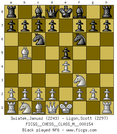 Last move : 1/2-1/2 2025 July 13 20:32:46 [Event "FICGS__CHESS__CLASS_M__000154"] [Site "FICGS"] [Date "2025.06.01"] [Round "1"] [White "Swiatek,Janusz"] [Black "Ligon,Scott"] [Result "1/2-1/2"] [WhiteElo "2243"] [BlackElo "2297"] 1.e4 e5 2.Nf3 Nc6 3.Bb5 Nf6 4.O-O Nxe4 5.Re1 Nd6 6.Nxe5 Be7 7.Bf1 Nxe5 8.Rxe5 O-O 9.d4 Bf6 10.Re1 Re8 11.c3 Rxe1 12.Qxe1 Ne8 13.Bf4 d5 14.Bd3 g6 15.Nd2 Ng7 16.Nf3 Bg4 17.Ne5 Bf5 18.Bxf5 Nxf5 19.Qd2 Be7 20.Nd3 f6 21.g4 Ng7 22.Re1 Qd7 23.Bg3 1/2-1/2 Follow this game move after move (download)Modern Chess is too much concerned with things like Pawn structure. Forget it, Checkmate ends the game. (Nigel Short) Glücklicherweise sind Großmeister Ruben Fines reine Schachbücher weniger phallozentrisch [als seine Schachpsychologie] und deswegen auch weniger lächerlich. (Nigel Short) El Ajedrez es parte de una cultura y si una cultura esta en decadencia, entonces también el Ajedrez declinará. (Mikhail Botvinnik) Seul un grand joueur sait à quel point il joue faiblement. (Xavier Tartacover) Life doesn't imitate art, it imitates bad television. (Woody Allen)
