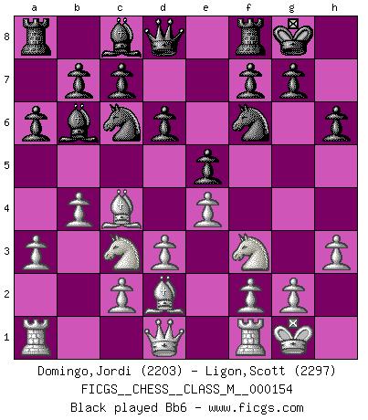 Last move : 1/2-1/2 2025 June 19 10:12:2 [Event "FICGS__CHESS__CLASS_M__000154"] [Site "FICGS"] [Date "2025.06.01"] [Round "1"] [White "Domingo,Jordi"] [Black "Ligon,Scott"] [Result "1/2-1/2"] [WhiteElo "2203"] [BlackElo "2297"] 1.e4 e5 2.Nf3 Nc6 3.Bc4 Nf6 4.d3 Bc5 5.Nc3 h6 6.Be3 Bb4 7.Bd2 O-O 8.O-O d6 9.a3 Ba5 10.h3 a6 11.b4 Bb6 12.Bb3 Ne7 13.Ne2 Ng6 14.Ng3 a5 15.Qc1 Nh7 16.Rb1 axb4 17.axb4 Be6 18.c4 c5 19.Bd1 Ra7 20.Be3 cxb4 21.Rxb4 Bxe3 22.Qxe3 Ra3 23.Rxb7 Ng5 24.Nxg5 hxg5 25.Ra7 Rxa7 26.Qxa7 Nf4 27.Be2 g6 28.Rb1 g4 29.Bxg4 Bxg4 30.hxg4 Kg7 31.d4 Qh4 32.Rb8 Rxb8 33.Qxb8 Qxg4 34.Qxd6 Qd1+ 35.Kh2 Qxd4 36.Qxd4 exd4 37.Nf1 Kf6 38.Nd2 Ne6 39.Kg3 Ke5 40.Kf3 g5 41.g3 Nc5 42.Ke2 g4 43.f4+ gxf3+ 44.Nxf3+ Kxe4 45.Ng5+ Kf5 46.Nxf7 Kg4 1/2-1/2 Follow this game move after move (download)I believe that Chess possesses a magic that is also a help in advanced age. A rheumatic knee is forgotten during a game of Chess and other events can seem quite unimportant in comparison with a catastrophe on the chessboard. (Vlastimil Hort) Frage: Was machen Sie mit den Preisen? Anwort: Ich habe Angst, dass meine Freundin davon neue Kleider kauft. (Loek van Wely) Uno por uno, yo los acribillé, mi superioridad muy pronto se volvio aparente. (Jose Capablanca) 'L'échange des dames est un coup dur pour les deux adversaires...' Un journaliste lors d'une partie du match Spassky-Fischer Coffee just isn't my cup of tea. (Unknown)