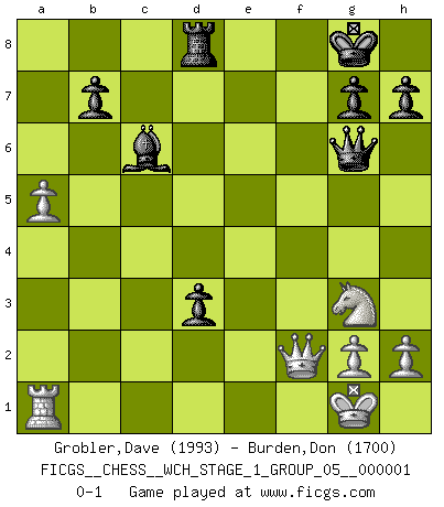 Last move : 0-1 2006 September 24 2:56:6 [Event "FICGS__CHESS__WCH_STAGE_1_GROUP_05__000001"] [Site "FICGS"] [Date "2006.07.01"] [Round "1"] [White "Grobler,Dave"] [Black "Burden,Don"] [Result "0-1"] [WhiteElo "1993"] [BlackElo "1700"] 1.e4 c5 2.Nf3 d6 3.Bb5+ Nc6 4.d4 cxd4 5.Qxd4 Bd7 6.Bxc6 Bxc6 7.c4 f5 8.Nc3 e5 9.Qe3 fxe4 10.Ng5 Nf6 11.O-O Be7 12.Ngxe4 Nxe4 13.Nxe4 O-O 14.Nc3 Qd7 15.Qd3 Rf5 16.Be3 a6 17.Rfd1 Raf8 18.Ne4 Qe6 19.b4 Rd8 20.b5 axb5 21.Ng3 e4 22.Qe2 Re5 23.Bd4 Rg5 24.cxb5 Rxb5 25.a4 Rb4 26.a5 d5 27.Qe3 Qg6 28.f3 Bg5 29.Qa3 Rxd4 30.Rxd4 Bf6 31.R4d1 Bxa1 32.Rxa1 exf3 33.Qxf3 d4 34.Qf2 d3 0-1 This chess game has been lost on time (started : 2006.07.01 16:5:54) Sicilian : Canal-Sokolsky (Nimzovich-Rossolimo, Moscow) attack Kingside Castling by player White (move 11) Kingside Castling by player Black (move 13) Player Black won this chess game. Follow this game move after move (download)There is only one thing Fischer does in Chess without pleasure: to lose ! (Boris Spassky) Fallen sollten polizeilich verboten werden. (Savielly Grigorievitsch Tartakower) En partidas rápidas, el Caballo es mas poderoso que el Alfil. (Vlastimil Hort) Le thème de l'attaque double intervient d'une manière ou d'une autre dans l'immense majorité des combinaisons. (Youri Averbakh) Quotation,n.: The act of repeating erroneously the words of another. The words erroneously repeated. (Ambrose Bierce, The Devil's Dictionary)