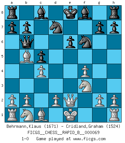 Last move : 1-0 2007 November 19 7:25:16 [Event "FICGS__CHESS__RAPID_B__000069"] [Site "FICGS"] [Date "2007.10.02"] [Round "1"] [White "Behrmann,Klaus"] [Black "Cridland,Graham"] [Result "1-0"] [WhiteElo "1671"] [BlackElo "1524"] 1.e4 c5 2.f4 d5 3.exd5 Nf6 4.Bb5+ Nbd7 5.c4 e6 6.dxe6 fxe6 7.Qe2 Qb6 8.Nf3 1-0 This chess game has been lost on time (started : 2007.10.02 22:29:26) Sicilian : Grand Prix attack Player White won this chess game. Follow this game move after move (download)It's just you and your opponent at the board and you're trying to prove something. (Bobby Fischer) Alles was ich jemals tun will ist Schach spielen. (Robert James Fischer) Por esta medida (el intervalo entre Fischer y sus contemporaneos), yo le considero el mas grande campeón mundial. (Garry Kasparov) Le système Elo représente seulement une moyenne. Il est simplement un indicateur de votre stabilité. (Anatoli Karpov) If everyone is thinking alike, then somebody isn't thinking. (US General George S. Patton)