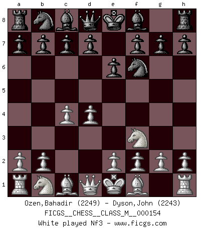 Last move : 1-0 2025 July 28 7:13:22 [Event "FICGS__CHESS__CLASS_M__000154"] [Site "FICGS"] [Date "2025.06.01"] [Round "1"] [White "Ozen,Bahadir"] [Black "Dyson,John"] [Result "1-0"] [WhiteElo "2249"] [BlackElo "2243"] 1.d4 Nf6 2.c4 e6 3.Nf3 d5 4.Nc3 dxc4 5.e4 b5 6.Nxb5 1-0 This chess game has been lost on time (started : 2025.06.01 21:36:26) Follow this game move after move (download)There are two classes of men; those who are content to yield to circumstances and who play whist; those who aim to control circumstances, and who play Chess. (Mortimer Collins) Strategie ist, wie man ein Mädchen auf den Rücksitz bekommt. Taktik ist, was man tut, wenn man dann dort ist. (Anonymous) El poder defensivo de una pieza clavada, solamente es imaginario. (Aaron Nimzovich) Les sacrifices démontrent seulement que quelqu'un a gaffé. (Savielly Tartacover) Life is pleasant. Death is peaceful. It's the transition that's troublesome. (Isaac Asimov)