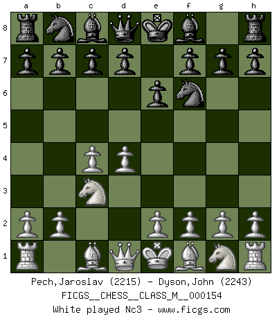 Last move : 1-0 2025 August 1 8:16:41 [Event "FICGS__CHESS__CLASS_M__000154"] [Site "FICGS"] [Date "2025.06.01"] [Round "1"] [White "Pech,Jaroslav"] [Black "Dyson,John"] [Result "1-0"] [WhiteElo "2215"] [BlackElo "2243"] 1.d4 Nf6 2.c4 e6 3.Nc3 Bb4 4.e3 O-O 5.Bd3 c5 6.Nf3 1-0 This chess game has been lost on time (started : 2025.06.01 21:36:26) Follow this game move after move (download)When you are lonely, when you feel yourself an alien in the world, play Chess. This will raise your spirits and be your counselor in war. (Aristotle) Schach ist wie eine schöne Frau, zu der wir ständig zurückkehren, gleichviel, wie oft sie uns zurückweist. (Anonymous) El arma más poderosa en el Ajedrez, es tener la próxima movida. (David Bronstein) Mais n'est-ce pas déjà le limiter injurieusement que d'appeler les échecs un jeu? N'est-ce pas aussi une science, un art, ou quelque chose qui, comme le cercueil de Mahomet entre ciel et terre, est suspendu entre l'un et l'autre, et qui réunit un nombre incroyable de contraires ? (Stefan Zweig) Computer Science is no more about computers than astronomy is about telescopes. (Edsger W. Dijkstra)