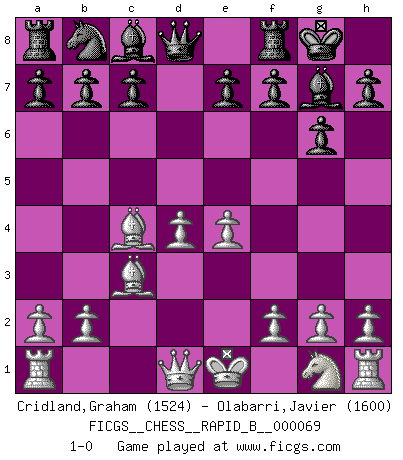 Last move : 1-0 2007 November 25 7:37:34 [Event "FICGS__CHESS__RAPID_B__000069"] [Site "FICGS"] [Date "2007.10.02"] [Round "1"] [White "Cridland,Graham"] [Black "Olabarri,Javier"] [Result "1-0"] [WhiteElo "1524"] [BlackElo "1600"] 1.d4 Nf6 2.c4 g6 3.Nc3 d5 4.cxd5 Nxd5 5.Bd2 Bg7 6.e4 Nxc3 7.Bxc3 O-O 8.Bc4 1-0 This chess game has been lost on time (started : 2007.10.02 22:29:26) King's Indian defense, 3.Nc3 Kingside Castling by player Black (move 7) Player White won this chess game. Follow this game move after move (download)I play correspondence chess because it is both art and science while chess is art only. (A player at FICGS) Ich verstehe mehr vom Schach als irgendein anderer lebender Meister. (José Raúl Capablanca) En manos de Fischer's, una diminuta ventaja teórica es tan buena como tener una Reina de ventaja. (Isaac Kashdan) Il vaut toujours mieux jouer un plan faux de façon logique que de n'avoir pas de plan du tout. (Victor Kortchnoï) The absolute truth is the thing that makes people laugh. (Carl Reiner)