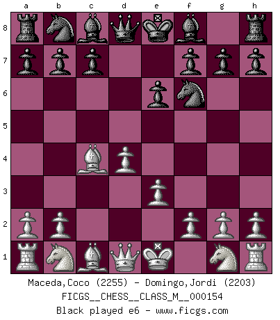 Last move : 1/2-1/2 2025 September 17 16:24:27 [Event "FICGS__CHESS__CLASS_M__000154"] [Site "FICGS"] [Date "2025.06.01"] [Round "1"] [White "Maceda,Coco"] [Black "Domingo,Jordi"] [Result "1/2-1/2"] [WhiteElo "2255"] [BlackElo "2203"] 1.d4 d5 2.c4 dxc4 3.e3 Nf6 4.Bxc4 e6 5.Nf3 c5 6.O-O a6 7.Bb3 Nc6 8.Nc3 Be7 9.dxc5 Qxd1 10.Rxd1 Bxc5 11.Bd2 Bd7 12.Rac1 Ba7 13.Ng5 Ke7 14.Nce4 Rhd8 15.Nxf6 Kxf6 16.Ne4+ Ke7 17.g4 e5 18.h3 Be6 19.Bxe6 Kxe6 20.Kg2 h6 21.h4 g6 22.Ng3 Rd7 23.Bc3 Rxd1 24.Rxd1 Rg8 25.Kf3 f5 26.h5 fxg4+ 27.Kxg4 gxh5+ 28.Kf3 Bc5 29.Rh1 Nd8 30.Rxh5 Nf7 31.Ne4 Be7 32.Ke2 Rg4 33.f3 Rg2+ 34.Nf2 Bg5 35.Rh3 Rg1 36.Nd3 Rg2+ 37.Kf1 Rc2 38.Ne1 Rc1 39.Ke2 Bf6 40.a3 b6 41.Kd2 Rb1 42.Nd3 Rg1 43.Ke2 Be7 44.Rh5 Rg2+ 45.Kf1 Rg5 46.Rh1 Rg8 47.Ke2 Rg2+ 48.Kf1 Rg8 49.Ke2 Rg2+ 50.Kf1 Rg8 1/2-1/2 Follow this game move after move (download)I'm not afraid of Spassky. The world knows I'm the best. You don't need a match to prove it. (Bobby Fischer) Zeige mir drei Eröffnungsvarianten und ich beweise dir, dass zwei davon inkorrekt sind. (Emanuel Lasker) Después de una mala apertura, hay una esperanza en el juego medio. Pero una vez que estas en finales, el momento de la verdad ha llegado. (Edmar Mednis) Les réformistes prétendent que les progrès de la théorie conduiront à la disparition des échecs, et qu'il faut, pour leur rendre vie, en remanier les règles. En réalité, qu'exprime cette affirmation? Le mépris de l'intuition, de l'imagination et de tous les autres éléments qui font des échecs un art. (Alexander Alekhine) Knowledge rests not upon truth alone, but upon error also. (Carl G. Jung)