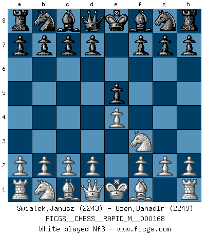 Last move : 1/2-1/2 2025 August 2 21:32:22 [Event "FICGS__CHESS__RAPID_M__000168"] [Site "FICGS"] [Date "2025.06.03"] [Round "1"] [White "Swiatek,Janusz"] [Black "Ozen,Bahadir"] [Result "1/2-1/2"] [WhiteElo "2243"] [BlackElo "2249"] 1.e4 e5 2.Nf3 Nc6 3.Bb5 Nf6 4.O-O Nxe4 5.Re1 Nd6 6.Nxe5 Be7 7.Bf1 Nxe5 8.Rxe5 O-O 9.d4 Bf6 10.Re1 Re8 11.Bf4 Rxe1 12.Qxe1 Bxd4 13.Bxd6 cxd6 14.Nc3 Be5 15.Nd5 b5 16.c3 Bb7 17.Qd2 Rb8 18.g3 Bxd5 19.Qxd5 Qb6 20.a4 bxa4 1/2-1/2 Follow this game move after move (download)Only the player with the initiative has the right to attack. (Wilhelm Steinitz) Das Schachspiel übertrifft alle anderen Spiele so weit wie der Chimborasso einen Misthaufen. (Arthur Schopenhauer) No es suficiente ser un buen jugador, se debe también de jugar bién. (Siegbert Tarrasch) Ne tendez aucun piège pour le plaisir ! Ne jouez rien dans l'espoir que l'adversaire réagisse de façon stupide ! Prenez toujours pour acquis que l'adversaire va trouver le meilleur coup ! Ne jouez jamais de coup dans l'espoir que l'adversaire ne voie pas la menace ! Chacun de vos coups doit améliorer la position d'une façon ou d'une autre. You must have a dream in order to have it come true. (A.P.J. Kalam)