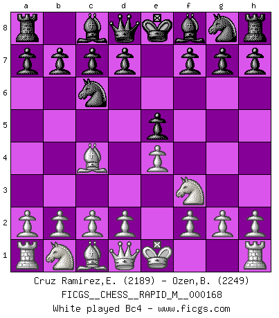 Last move : 1/2-1/2 2025 August 1 19:11:47 [Event "FICGS__CHESS__RAPID_M__000168"] [Site "FICGS"] [Date "2025.06.03"] [Round "1"] [White "Cruz Ramirez,Eliecer"] [Black "Ozen,Bahadir"] [Result "1/2-1/2"] [WhiteElo "2189"] [BlackElo "2249"] 1.e4 e5 2.Nf3 Nc6 3.Bc4 Bc5 4.c3 Nf6 5.d3 d6 6.b4 Bb6 7.a4 a5 8.b5 Ne7 9.Nbd2 O-O 10.O-O Ng6 11.d4 Bg4 12.Qc2 Qd7 13.Re1 Rfe8 14.h3 Bxf3 15.Nxf3 exd4 16.Bb2 dxc3 17.Bxc3 Ne5 18.Nxe5 dxe5 19.Rad1 Qe7 20.Rd3 h6 1/2-1/2 Follow this game move after move (download)It is not enough to be a good player... you must also play well. (Siegbert Tarrasch) Ich kenne keine einzige Person, die behaupten würde, Garri Kasparow sei ein guter Mensch (Nigel Short) Prefiero perder una partida realmente buena, que ganar una mala. (David Levy) Le temps de noter son nom sur la feuille de partie, j'étais déjà en zeitnot ! D'un modeste amateur apparié lors de la première ronde d'un open contre le grand-maître Azmaïparashvili. Creativity involves breaking out of established patterns in order to look at things in a different way. (Edward De Bono)