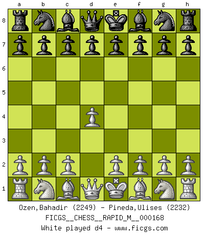Last move : 1/2-1/2 2025 August 10 21:32:53 [Event "FICGS__CHESS__RAPID_M__000168"] [Site "FICGS"] [Date "2025.06.03"] [Round "1"] [White "Ozen,Bahadir"] [Black "Pineda,Ulises"] [Result "1/2-1/2"] [WhiteElo "2249"] [BlackElo "2232"] 1.d4 Nf6 2.c4 e6 3.Nf3 d5 4.Nc3 Bb4 5.Bg5 dxc4 6.e4 c5 7.Bxc4 cxd4 8.Nxd4 Bxc3+ 9.bxc3 Qa5 10.Nb5 Nxe4 11.Qd4 O-O 12.Qxe4 a6 13.O-O axb5 14.Bd3 f5 15.Qe2 Nc6 16.Bd2 Qc7 17.Bxb5 e5 18.Qc4+ Kh8 19.Rfe1 f4 20.Bxc6 bxc6 21.Qc5 1/2-1/2 Follow this game move after move (download)Methodical thinking is of more use in Chess than inspiration. (C. J. S. Purdy) Der Traum, für den ich lebe, ist der von einem freien Russland. Viele mögen sagen: Russland hat doch ein Parlament, einen gewählten Präsidenten. Aber ich spüre, dass in meiner Heimat die Angst wiederkehrt. Eine Angst, sich frei zu äußern, bestimmte Dinge zu tun (Garry Kasparov) El jugador táctico sabe que hacer cuando hay algo que hacer; mientras que el estratega sabe que hacer cuando no hay nada que hacer. (Gerald Abrahams) 'L'échange des dames est un coup dur pour les deux adversaires...' Un journaliste lors d'une partie du match Spassky-Fischer It's only after you lost everything, Tyler says, that you're free to do anything. (Chuck Palahniuk, Fight Club)