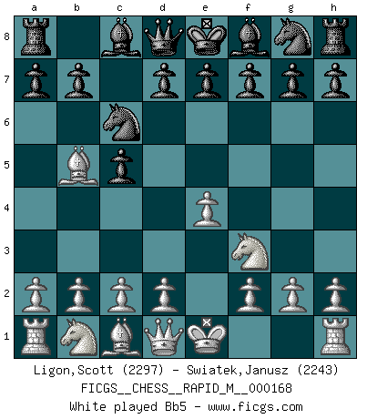 Last move : 1/2-1/2 2025 August 15 7:34:58 [Event "FICGS__CHESS__RAPID_M__000168"] [Site "FICGS"] [Date "2025.06.03"] [Round "1"] [White "Ligon,Scott"] [Black "Swiatek,Janusz"] [Result "1/2-1/2"] [WhiteElo "2297"] [BlackElo "2243"] 1.e4 c5 2.Nf3 Nc6 3.Bb5 e6 4.O-O Nge7 5.d4 cxd4 6.Nxd4 Ng6 7.Be3 Be7 8.c3 O-O 9.f4 e5 10.fxe5 Ngxe5 11.Nf5 d6 12.Na3 a6 13.Be2 Bxf5 14.Rxf5 Nd7 15.Bc4 Qc7 16.Bb3 Rae8 17.Kh1 Na5 18.Bd5 Nf6 19.Bf4 Nxd5 20.Qxd5 g6 21.Qxa5 b6 22.Qxa6 gxf5 23.Bh6 fxe4 24.Qe2 Qd7 25.Nc2 Qe6 26.Bxf8 Bxf8 27.Nd4 Qd7 28.Rf1 Re5 29.a3 Bg7 30.Kg1 d5 31.h4 h6 32.Qe3 Qg4 33.Qf4 Qg6 34.Nf5 Re8 35.Qd2 Re5 36.Ne3 Qe6 37.a4 Qd7 38.b3 h5 39.Kh1 Bh6 40.Kg1 1/2-1/2 Follow this game move after move (download)By the beauty of his games, the clarity of his play, and the brilliance of his ideas, Fischer made himself an artist of the same stature as Brahms, Rembrandt, and Shakespeare. (David Levy) Das Blackmar-Diemer-Gambit verändert den ganzen Menschen! (Emil Joseph Diemer) Yo considero que Fischer es uno de los expertos mas grandes de aperturas de siempre. (Keith Hayward) Toute estimation doit être constamment réévaluée. (Jacob Estrin) In theory there is no difference between theory and practice. In practice there is. (Yogi Berra)