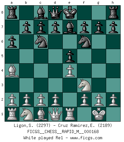 Last move : 1/2-1/2 2025 July 6 15:43:42 [Event "FICGS__CHESS__RAPID_M__000168"] [Site "FICGS"] [Date "2025.06.03"] [Round "1"] [White "Ligon,Scott"] [Black "Cruz Ramirez,Eliecer"] [Result "1/2-1/2"] [WhiteElo "2297"] [BlackElo "2189"] 1.e4 e5 2.Nf3 Nc6 3.Bb5 a6 4.Ba4 Nf6 5.O-O Be7 6.Re1 b5 7.Bb3 O-O 8.c3 d5 9.exd5 Nxd5 10.Nxe5 Nxe5 11.Rxe5 c6 12.Re1 Bd6 13.d3 Bf5 14.Qf3 Qh4 15.g3 Qh3 16.Be3 Bxd3 17.Nd2 Bf5 18.Bd4 Rfd8 19.a4 Bg4 20.Qe4 Qh5 21.axb5 axb5 22.Bxd5 cxd5 23.Qd3 Rxa1 24.Rxa1 Be2 1/2-1/2 Follow this game move after move (download)You may learn much more from a game you lose than from a game you win. You will have to lose hundreds of games before becoming a good player. (Jose Raul Capablanca) Konzentriere dich auf materielle Gewinne. Nimm, was dir dein Gegner gibt, ausser es gibt einen guten Grund der dagegenspricht. (Robert James Fischer) Yo adoro todas la posiciones. Denme una partida posicional difícil, y la jugaré. Pero posiciones totalmente ganadas, no las tolero. (Hein Donner) Votre prénom est 'Tactique', votre deuxième prénom est 'Tactique' et votre nom est 'Tactique'. (Ken Smith) God, you are such an idiot. - Actually, I thought I was more of a jerk. (Gregory House to Stacy Warner, House M.D.)