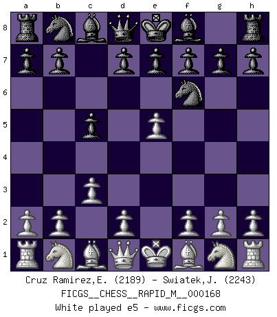 Last move : 1/2-1/2 2025 August 17 6:53:57 [Event "FICGS__CHESS__RAPID_M__000168"] [Site "FICGS"] [Date "2025.06.03"] [Round "1"] [White "Cruz Ramirez,Eliecer"] [Black "Swiatek,Janusz"] [Result "1/2-1/2"] [WhiteElo "2189"] [BlackElo "2243"] 1.e4 c5 2.c3 Nf6 3.e5 Nd5 4.Nf3 d6 5.d4 cxd4 6.cxd4 Nc6 7.Bc4 Nb6 8.Bb5 dxe5 9.Nxe5 Bd7 10.Bxc6 Bxc6 11.O-O g6 12.Nxc6 bxc6 13.Nc3 Bg7 14.Be3 O-O 15.Rc1 Nc4 16.b3 Nxe3 17.fxe3 e5 18.d5 cxd5 19.Nxd5 Kh8 20.b4 Rc8 21.Qb3 Qd7 22.b5 e4 23.Rxc8 Rxc8 24.Rd1 Qe6 25.Qa4 Qg4 26.Ne7 Rf8 27.Qc2 h5 28.h3 Qe6 29.Nd5 Rd8 30.Qc6 1/2-1/2 Follow this game move after move (download)What is the difference between chess and football? Everybody understands football, but nobody plays it. Everybody plays chess, but nobody understands it. Everything is relative. (Vladimir Kramnik) Ohne ihre Erfolge schmälern zu wollen würde ich sagen Petrosian, Spassky und Karpov verdanken ihre Siege ihren Trainern - Boleslavsky, Bondarevsky und Furman. (Mikhail Moiseyevich Botvinik) Desconfianza es la característica mas necesaria de un jugador de Ajedrez. (Siegbert Tarrasch) Aucun coup ne doit être joué sans but. (Pedro Damiano) A proverb is a short sentence based on long experience. (Miguel de Cervantes)