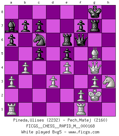 Last move : 1/2-1/2 2025 October 25 2:8:49 [Event "FICGS__CHESS__RAPID_M__000168"] [Site "FICGS"] [Date "2025.06.03"] [Round "1"] [White "Pineda,Ulises"] [Black "Pech,Matej"] [Result "1/2-1/2"] [WhiteElo "2232"] [BlackElo "2160"] 1.e4 e5 2.Nf3 Nc6 3.Bc4 Nf6 4.d3 Bc5 5.Nc3 d6 6.Na4 Bb6 7.a3 h6 8.O-O O-O 9.h3 Re8 10.Ba2 Be6 11.b4 a6 12.c4 Ba7 13.Nc3 g5 14.Ne2 g4 15.hxg4 Nxg4 16.g3 Kh7 17.Kg2 Qf6 18.c5 dxc5 19.Bxe6 Rxe6 20.Neg1 Rg8 21.Nh3 Rg7 22.Nfg5+ hxg5 23.Qxg4 Kg8 24.Bxg5 Qg6 25.f4 exf4 26.Rxf4 cxb4 27.Rf5 Be3 28.axb4 Bxg5 29.Rxg5 Ne5 30.Rxg6 Nxg4 31.Rxe6 fxe6 32.Rc1 Ne5 33.Nf4 Rd7 34.Rc5 Nxd3 35.Nxd3 Rxd3 36.Rxc7 b5 37.Rc6 Kf7 38.Rxa6 Rb3 39.Rb6 Rxb4 40.Kf3 e5 41.g4 Rb3+ 42.Ke2 b4 43.g5 Rb1 44.Kd2 b3 45.Rf6+ Kg7 46.Rb6 b2 47.Kc2 1/2-1/2 Follow this game move after move (download)There just isn't enough televised Chess. (David Letterman) Im Wettkampf zwischen starken Meistern kommen Fehler sehr selten vor, deshalb ist es mit bloßem Warten nicht getan. (José Raúl Capablanca) Tu sabes, camarada Pachman, no disfruto el ser un Ministro, preferería jugar al Ajedrez como tu. (Che Guevara) Les écrivains ont utilisé les échecs pour analyser les côtés extrêmes de la nature humaine. Dans ce cadre, les échecs offrent un champ d'expérimentation idéal. Mais on pourrait faire la même chose avec la peinture. Et là, en vous référant à Van Gogh, vous ne tirerez pas de conclusion définitive sur les peintres. (Gary Kasparov) Chess, like love, like music, has the power to make people happy. (Siegbert Tarrasch)