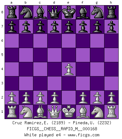 Last move : 1/2-1/2 2025 July 23 12:28:18 [Event "FICGS__CHESS__RAPID_M__000168"] [Site "FICGS"] [Date "2025.06.03"] [Round "1"] [White "Cruz Ramirez,Eliecer"] [Black "Pineda,Ulises"] [Result "1/2-1/2"] [WhiteElo "2189"] [BlackElo "2232"] 1.e4 e5 2.Nf3 Nc6 3.Bc4 Bc5 4.c3 Nf6 5.d4 exd4 6.cxd4 Bb4+ 7.Bd2 Nxe4 8.Bxb4 Nxb4 9.Bxf7+ Kxf7 10.Qb3+ Ke8 11.Qxb4 Qe7 12.Qxe7+ Kxe7 13.O-O Nf6 14.Re1+ Kd8 15.Nc3 d6 16.Ng5 Rf8 17.Re3 h6 18.Nge4 Ng8 19.Rae1 Bd7 20.a4 Rf7 21.b4 a6 22.d5 Ne7 1/2-1/2 Follow this game move after move (download)Chess, like any creative activity, can exist only through the combined efforts of those who have creative talent, and those who have the ability to organize their creative work. (Mikhail Botvinnik) Wenn ein Kopf und ein Buch zusammenstoßen und es klingt hohl, ist es denn allemal im Buche? (Georg Christoph Lichtenberg) Prefiero perder una partida realmente buena, que ganar una mala. (David Levy) Pour se monter efficace, un Cavalier a besoin d'avant-postes ! Les Cavaliers font les meilleurs bloqueurs de pions passés. It's unlucky to be superstitious. (Dave Enteles)