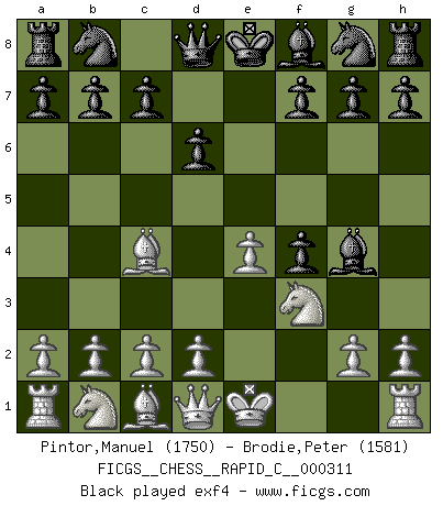 Last move : 0-1 2025 August 11 1:18:21 [Event "FICGS__CHESS__RAPID_C__000311"] [Site "FICGS"] [Date "2025.06.06"] [Round "1"] [White "Pintor,Manuel"] [Black "Brodie,Peter"] [Result "0-1"] [WhiteElo "1750"] [BlackElo "1581"] 1.e4 e5 2.f4 d6 3.Nf3 Bg4 4.Bc4 exf4 5.O-O Nf6 6.d3 Be7 7.Bxf4 O-O 8.Nc3 Nc6 9.h3 Bh5 10.Qe1 Bg6 11.Ne2 Nb4 12.Qxb4 Qd7 13.Qb3 b6 14.Ng5 Qe8 15.Ng3 h6 16.Nf3 Rb8 17.Nf5 Bxf5 18.exf5 Rc8 19.Rae1 Rd8 20.Nh4 d5 21.Bb5 c6 22.Ba6 Qd7 23.c4 dxc4 24.Bxc4 b5 25.Ng6 Rfe8 26.Bxf7+ Kh7 27.Bxe8 Rxe8 28.Qf7 Bc5+ 0-1 Follow this game move after move (download)One doesn't have to play well, it's enough to play better than your opponent. (Siegbert Tarrasch) Ich verlor meine Bürgerrechte, mein Gehalt wurde mir nicht mehr bezahlt und ich wurde zensiert und durfte nicht mehr ins Ausland reisen. [nach dem Match Fischer-Taimanov 6:0] (Mark Taimanov) El Ajedrez es un juego terrible. Si no dominas el centro, tu oponente tiene una posición mas libre. Si tu tienes el centro, entonces realmente tienes algo de que preocuparte. (Siegbert Tarrasch) Les Echecs ont trois composantes : le temps, l'espace et le matériel en dernier. (Mikhail Tal) If you work for a living, why do you kill yourself working ? (Tuco to a chicken in The Good, The Bad and The Ugly)