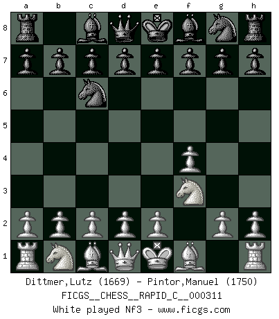 Last move : 0-1 2025 July 22 13:6:26 [Event "FICGS__CHESS__RAPID_C__000311"] [Site "FICGS"] [Date "2025.06.06"] [Round "1"] [White "Dittmer,Lutz"] [Black "Pintor,Manuel"] [Result "0-1"] [WhiteElo "1669"] [BlackElo "1750"] 1.f4 Nc6 2.Nf3 d5 3.e3 Bf5 4.Bb5 f6 5.O-O e6 6.Nh4 Bg6 7.b3 Bc5 8.Bxc6+ bxc6 9.Bb2 Bf7 10.d3 Ne7 11.Kh1 Bxe3 12.Nc3 d4 0-1 This chess game has been lost on time (started : 2025.06.06 23:35:31) Follow this game move after move (download)There are two types of sacrifices: correct ones and mine. (Mikhail Tal) Wenn sie aufgeben, dann danke ich Ihnen für das Spiel (Eventualzug beim Fernschach). (Anonymous) Diferente gente reacciona diferentemente en aceptar la derrota. (Bobby Fischer) Vouloir jouer aux échecs contre soi-même est aussi paradoxal que vouloir marcher sur son ombre. (Stefan Zweig) Just because you do not take an interest in politics doesn't mean politics won't take an interest in you. (Pericles 430 B.C.)