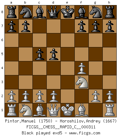 Last move : 0-1 2025 July 1 17:32:47 [Event "FICGS__CHESS__RAPID_C__000311"] [Site "FICGS"] [Date "2025.06.06"] [Round "1"] [White "Pintor,Manuel"] [Black "Horoshilov,Andrey"] [Result "0-1"] [WhiteElo "1750"] [BlackElo "1667"] 1.e4 c5 2.f4 e6 3.Nf3 d5 4.exd5 exd5 5.d4 Nf6 6.Bb5+ Bd7 7.Bxd7+ Nbxd7 8.O-O Be7 9.c3 O-O 10.Nbd2 Re8 11.Ne5 cxd4 12.cxd4 Nxe5 13.dxe5 Ne4 14.Qf3 Nxd2 15.Bxd2 Qb6+ 16.Be3 d4 17.Bf2 Rad8 18.b3 Bc5 19.Kh1 Re6 20.Rad1 Qc6 21.Qxc6 Rxc6 22.h4 d3 23.Bxc5 Rxc5 24.Rd2 Rc2 25.Rfd1 Rxd2 26.Rxd2 Kf8 27.g3 g6 28.Kg2 Ke7 29.Kf3 f6 30.exf6+ Kxf6 31.g4 h5 32.gxh5 gxh5 33.Ke4 Re8+ 34.Kxd3 Kf5 35.Kc4 Re4+ 36.Kd5 Rxf4 37.Rd4 Rxd4+ 38.Kxd4 Kg4 39.Ke4 Kxh4 40.Kf4 Kh3 41.Kf3 h4 42.a3 b5 43.a4 a6 44.Kf2 Kg4 45.Kg2 b4 46.a5 Kf4 47.Kh3 Ke4 48.Kxh4 Kd4 0-1 Follow this game move after move (download)After black's reply to 1.e4 with 1..e5, leaves him always trying to get into the game. (Howard Staunton) Jeder leidlich begabte Spieler, er braucht keineswegs hervorragend veranlagt zu sein, kann es zum Meister bringen. Aber das ist ja auch gar nicht nötig! Der richtige Standpunkt ist es, zu seinem Vergnügen zu spielen, und man glaube ja nicht, dass der Genuss proportional dem Können sei. (Siegbert Tarrasch) El Ajedrez, como cualquier actividad creativa, solo puede existir a través del esfuerzo combinado de aquellos que tienen talento creativo y de aquellos que poseen la habilidad de organizar su trabajo creativo. (Mikhail Botvinnik) Les échecs, c'est l'imagination. (David Bronstein) Internal peace cannot coexist with external war. (Don Groves)