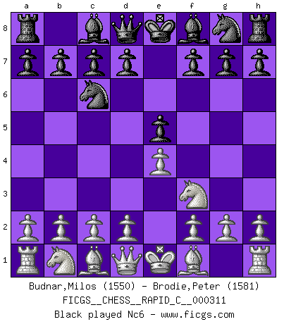 Last move : 1/2-1/2 2025 August 3 11:16:33 [Event "FICGS__CHESS__RAPID_C__000311"] [Site "FICGS"] [Date "2025.06.06"] [Round "1"] [White "Budnar,Milos"] [Black "Brodie,Peter"] [Result "1/2-1/2"] [WhiteElo "1550"] [BlackElo "1581"] 1.e4 e5 2.Nf3 Nc6 3.Bb5 d6 4.h3 Bd7 5.O-O Nf6 6.d3 Be7 7.Bg5 O-O 8.Nc3 a6 9.Bc4 Be6 10.Bxe6 fxe6 11.Bxf6 Bxf6 12.a3 Qd7 13.g3 Nd4 14.Nxd4 exd4 15.Na2 e5 16.Qg4 Qxg4 17.hxg4 a5 18.a4 c5 19.c3 dxc3 20.Nxc3 Rfd8 21.Nd5 Rac8 22.Nxf6 gxf6 23.f4 exf4 24.gxf4 Kg7 25.f5 Re8 26.Kg2 Rh8 27.Rac1 h5 28.Rf4 h4 29.Rh1 Rh7 30.Rf3 Rch8 31.Rfh3 1/2-1/2 Follow this game move after move (download)I won't play with you anymore. You have insulted my friend. - When an opponent cursed himself for a blunder. (Miguel Najdorf) Aljechin war kein Nazi. Er war ein Opportunist. Ein schrecklicher Mann. Er liebte Geld über alles und würde für Geld ein Jude, ein Katolik oder ein Protestant werden. (Miguel Najdorf) No hay un Gran Maestro de Ajedrez que sea normal; solo se diferencían ellos por la magnitud de su locura. (Viktor Korchnoi) Votre prénom est 'Tactique', votre deuxième prénom est 'Tactique' et votre nom est 'Tactique'. (Ken Smith) Art is the triumph over chaos. (John Cheever)