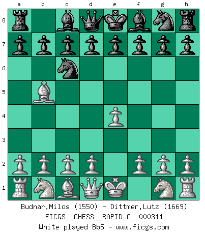 Last move : 1-0 2025 July 21 5:49:55 [Event "FICGS__CHESS__RAPID_C__000311"] [Site "FICGS"] [Date "2025.06.06"] [Round "1"] [White "Budnar,Milos"] [Black "Dittmer,Lutz"] [Result "1-0"] [WhiteElo "1550"] [BlackElo "1669"] 1.e4 Nc6 2.Bb5 d6 3.h3 e6 4.Nf3 Bd7 5.O-O Qf6 6.d3 O-O-O 7.Bg5 Qg6 8.Bxd8 Kxd8 9.Nh4 Qh6 10.Nc3 Qxh4 11.Qf3 1-0 This chess game has been lost on time (started : 2025.06.06 23:35:31) Follow this game move after move (download)For me, Chess is life and every game is like a new life. Every Chess player gets to live many lives in one lifetime. (Eduard Gufeld) Wer mein Gambit spielt, muß bereit sein, alle Brücken hinter sich abzubrechen. Es verändert den ganzen Menschen. Es wirkt wie ein Zauberstab und fördert verkümmerte, gute Charakter- eigenschaften wieder zu Tage. (Emil Joseph Diemer) Realmente no sabemos como el juego fue inventado, aunque hay sospechas. Tan pronto como descubramos a los culpables, se los haremos saber. (Bruce Pandolfini) Demandez au pauvre Cg1 ce qu'il en pense. Eduard Gufeld à propos de la variante Saemisch de l'Est-Indienne. Live, lose, and learn, by observing your opponent how to win. (Amber Steenbock)