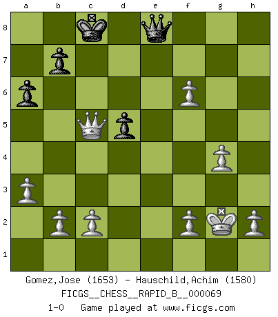 Last move : 1-0 2008 January 5 22:46:43 [Event "FICGS__CHESS__RAPID_B__000069"] [Site "FICGS"] [Date "2007.10.02"] [Round "1"] [White "Gomez,Jose"] [Black "Hauschild,Achim"] [Result "1-0"] [WhiteElo "1653"] [BlackElo "1580"] 1.d4 Nf6 2.Nc3 d5 3.Bf4 Bf5 4.e3 e6 5.Bd3 Bxd3 6.Qxd3 Bd6 7.Nf3 Bxf4 8.exf4 O-O 9.O-O Nc6 10.Rae1 Ne7 11.Ne5 Qd6 12.Rd1 Nf5 13.Rfe1 Rfc8 14.g4 Ne7 15.a3 a6 16.Qe3 Rd8 17.Ne2 Nd7 18.Ng3 Nb6 19.Nh5 Nc6 20.f5 Nxe5 21.dxe5 Qf8 22.Qg5 Nc4 23.Nf6+ Kh8 24.Nxh7 Qg8 25.Rd3 Qxh7 26.Kg2 f6 27.exf6 gxf6 28.Qxf6+ Kg8 29.Rxe6 Qg7 30.Qh4 Ne5 31.Re3 Rd6 32.R3xe5 Rf8 33.Rxd6 cxd6 34.Re7 Rf7 35.Re8+ Rf8 36.Rxf8+ Qxf8 37.Qg5+ Kf7 38.Qg6+ Ke7 39.Qe6+ Kd8 40.f6 Qe8 41.Qxd6+ Kc8 42.Qc5+ 1-0 This chess game has been lost on time (started : 2007.10.02 22:29:26) Queen's pawn game Kingside Castling by player Black (move 8) Kingside Castling by player White (move 9) Player White won this chess game. Follow this game move after move (download)Daring ideas are like Chess men moved forward. They may be beaten, but they may start a winning game. (Johann Wolfgang von Goethe) Die Fehler sind da, Sie warten nur darauf gemacht zu werden. (Savielly Grigorievitsch Tartakower) El Ajedrez es sobre todo, ¡una pelea!. (Emanuel Lasker) Ce n'est pas pour s'amuser qu'il joue aux échecs : il célèbre un culte. (Vladimir Nabokov) You cannot beat a roulette table unless you steal money from it. (Albert Einstein)