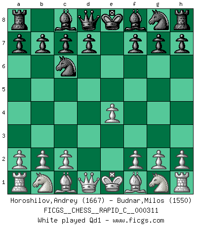 Last move : 1-0 2025 June 23 6:17:54 [Event "FICGS__CHESS__RAPID_C__000311"] [Site "FICGS"] [Date "2025.06.06"] [Round "1"] [White "Horoshilov,Andrey"] [Black "Budnar,Milos"] [Result "1-0"] [WhiteElo "1667"] [BlackElo "1550"] 1.e4 e5 2.d4 exd4 3.Qxd4 Nc6 4.Qd1 a6 5.Nf3 h6 6.Bc4 Qe7 7.O-O d6 8.Nc3 Be6 9.Bxe6 Qxe6 10.Re1 O-O-O 11.Nd4 Nxd4 12.Qxd4 c5 13.Qd5 Qxd5 14.Nxd5 Kb8 15.Bd2 Nf6 16.c4 Nxd5 17.exd5 g5 18.Bc3 Rg8 19.Re3 f5 20.Rae1 Bg7 21.Bxg7 Rxg7 22.Re7 Rg6 23.R7e6 Rxe6 24.Rxe6 h5 25.f3 g4 26.Kf2 Rd7 27.Rf6 b5 28.b3 bxc4 29.bxc4 a5 30.Rxf5 gxf3 31.Kxf3 Rh7 32.h4 Kc7 33.Kg3 Kb6 34.a4 Rg7 35.Rg5 Rh7 36.Kh3 Kc7 37.g4 hxg4 38.Kxg4 Re7 39.Rf5 Re4 40.Rf4 Re5 41.h5 Kd7 42.h6 Re7 43.Kh5 Ke8 44.Kg6 1-0 Follow this game move after move (download)If one piece is badly posted, the whole game is bad. (Tarrasch) Der Schachmeister von Heute braucht Courage, einen Killerinstinkt, Ausdauer und Arroganz. (Larry Evans) Las ideas audaces son como las piezas del Ajedrez que avanzan hacia adelante. Ellas pueden ser vencidas, pero también pueden iniciar una partida victoriosa. (Goethe) Il a essayé de se convaincre qu'il pourrait empêcher toutes les erreurs et ne jamais perdre. L'horreur ! Gary Kasparov au sujet de Robert Fischer. You think that education is too expensive ? Try ignorance. (Derek Bok)