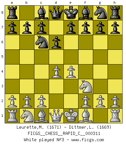 Last move : 1-0 2025 July 5 12:36:46 [Event "FICGS__CHESS__RAPID_C__000311"] [Site "FICGS"] [Date "2025.06.06"] [Round "1"] [White "Leurette,Marc-Antoine"] [Black "Dittmer,Lutz"] [Result "1-0"] [WhiteElo "1671"] [BlackElo "1669"] 1.e4 Nc6 2.d4 d6 3.Nf3 Bg4 4.Bb5 e5 5.d5 Qd7 6.Nbd2 O-O-O 7.a4 Bxf3 8.Qxf3 Qe7 9.Bxc6 bxc6 10.dxc6 Qf6 11.Qb3 d5 12.Qb7+ 1-0 Follow this game move after move (download)Modern Chess is too much concerned with things like Pawn structure. Forget it, Checkmate ends the game. (Nigel Short) Ein bischen Romantik kann weder im Schach noch in der Liebe schaden. Also versuche ich mich ab und zu daran zu erinnern. (Nigel Short) Coloca el contenido de las piezas del Ajedrez en un sombrero, agitalo vigorosamente, arrojalas en un tablero desde una altura de 30 centimetros y así obtendras el estilo de Steinitz. (H. E. Bird) Donnez-moi un Cavalier en 6e et je gagnerais toutes mes parties. (Steinitz) Luck is the residue of design. (John Milton)