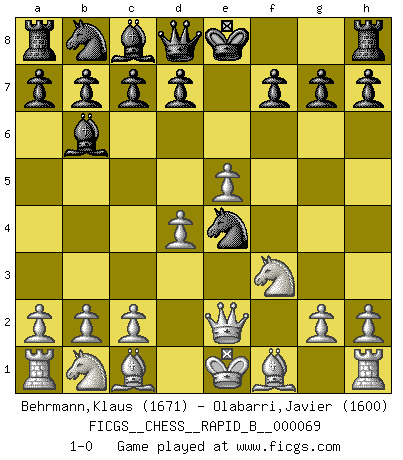 Last move : 1-0 2007 November 13 7:10:34 [Event "FICGS__CHESS__RAPID_B__000069"] [Site "FICGS"] [Date "2007.10.02"] [Round "1"] [White "Behrmann,Klaus"] [Black "Olabarri,Javier"] [Result "1-0"] [WhiteElo "1671"] [BlackElo "1600"] 1.e4 e5 2.f4 Nf6 3.fxe5 Nxe4 4.Nf3 Bc5 5.d4 Bb6 6.Qe2 1-0 This chess game has been lost on time (started : 2007.10.02 22:29:26) KGD : 2...Nf6 Player White won this chess game. Follow this game move after move (download)I know people who have all the will in the world, but still can't play good Chess. (Bobby Fischer) Ich war zu klein für die Schach-Schülermannschaft! (Woody Allen) No hay un Gran Maestro de Ajedrez que sea normal; solo se diferencían ellos por la magnitud de su locura. (Viktor Korchnoi) Comme les marins qui ont mille raisons différentes d'aller en mer, les joueurs d'échecs en ont tout autant avant de s'installer devant une table et jouer... (Vincent Bertignac, philosophe) We're missing something. (Gregory House, House M.D.)