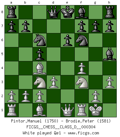 Last move : 1-0 2025 November 13 18:6:22 [Event "FICGS__CHESS__CLASS_D__000304"] [Site "FICGS"] [Date "2025.06.16"] [Round "1"] [White "Pintor,Manuel"] [Black "Brodie,Peter"] [Result "1-0"] [WhiteElo "1750"] [BlackElo "1581"] 1.e4 c5 2.f4 d5 3.exd5 Qxd5 4.Nf3 Bg4 5.Nc3 Qd8 6.Bc4 e6 7.d3 Nf6 8.O-O Nc6 9.h3 Bh5 10.Qe1 Be7 11.Ne5 Nxe5 12.fxe5 Nd7 13.Qg3 Bg6 14.Ne4 O-O 15.Ng5 h6 16.Nxe6 fxe6 17.Qxg6 Qe8 18.Bxe6+ Kh8 19.Qg3 Nxe5 20.Qxe5 Rf6 21.Qd5 Qc6 22.Qxc6 bxc6 23.Rxf6 Bxf6 24.c3 Re8 25.Bd7 Rd8 26.Bf5 Rd5 27.Be4 Rd6 28.Bf4 Re6 29.a4 a5 30.Kf2 Bg5 31.Bxg5 hxg5 32.Ke3 Kg8 33.Kf3 Rf6+ 34.Kg4 Rf2 35.Rb1 Rd2 36.Kxg5 c4 37.dxc4 c5 38.g4 Re2 39.Bg6 Re4 40.Bxe4 1-0 Follow this game move after move (download)If your opponent offers you a draw, try to work out why he thinks he's worse off. (Nigel Short) Nach Morphy wurde nichts neues mehr in der Behandlung offener Positionen gefunden. (Mikhail Moiseyevich Botvinik) Aún el Rey más flojo huye despavorido ante la amenaza de un Jaque doble. (Aaron Nimzowitsch) A chaque perte on perd un peu de soi. (Joël Lautier) But they are useless. They can only give you answers. (Pablo Picasso, about computers)