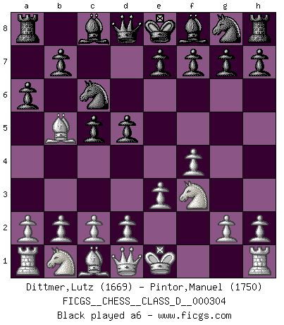Last move : 0-1 2025 July 28 7:13:22 [Event "FICGS__CHESS__CLASS_D__000304"] [Site "FICGS"] [Date "2025.06.16"] [Round "1"] [White "Dittmer,Lutz"] [Black "Pintor,Manuel"] [Result "0-1"] [WhiteElo "1669"] [BlackElo "1750"] 1.f4 d5 2.Nf3 c5 3.e3 Nc6 4.Bb5 a6 5.O-O axb5 6.d3 Bg4 7.Qe1 e6 0-1 This chess game has been lost on time (started : 2025.06.16 12:6:11) Follow this game move after move (download)Chess is a terrible game. If you have no center, your opponent has a freer position. If you do have a center, then you really have something to worry about ! (Siegbert Tarrasch) Pläne sind die Träume des Verständigen. (Ernst Freiherr von Feuchtersleben) Nunca antes ha habido un jugador de Ajedrez con tal conocimiento a fondo de las complejidades del juego y una inmensa voluntad absolutamente indomable de ganar. Yo pienso que Fischer es el jugador mas grande que jamás haya existido. (Lisa Lane) En blitz, le Cavalier l'emporte sur le Fou. (Vlastimil Hort) CHESS, n. f. [echecs, Fr.] A nice and abstruse game, in which two sets of puppets are moved in opposition to each other. (Dr Samuel Johnson, A Dictionary Of The English Language, 1755)