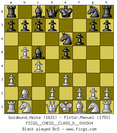 Last move : 0-1 2025 September 29 16:14:59 [Event "FICGS__CHESS__CLASS_D__000304"] [Site "FICGS"] [Date "2025.06.16"] [Round "1"] [White "Goldmund,Heike"] [Black "Pintor,Manuel"] [Result "0-1"] [WhiteElo "1631"] [BlackElo "1750"] 1.b4 e5 2.Bb2 f6 3.a3 Nc6 4.b5 Nd4 5.e3 Ne6 6.c4 Bc5 7.d3 d6 8.Nf3 Ne7 9.Be2 O-O 10.O-O a6 11.a4 a5 12.Nbd2 b6 13.Nb3 h6 14.Nxc5 Nxc5 15.Re1 Bb7 16.d4 exd4 17.exd4 Nd7 18.d5 Nc5 19.Nd4 Ng6 20.Bf3 Ne5 21.Be2 Ncd7 22.Ne6 Qe7 23.Nxf8 Rxf8 24.Qc2 Re8 25.f4 Nf7 26.Bc3 Qe3+ 27.Kh1 Qxf4 28.Bd2 Qh4 29.Qg6 Nde5 30.Qf5 Ng5 31.Bxg5 hxg5 32.g3 Qd4 33.Bh5 Re7 34.Qe4 Qc3 35.Rac1 Qb3 36.Bd1 Qb4 37.Qe3 Nc6 38.Qxe7 Nxe7 39.Rxe7 Qd2 40.Rb1 Qd3 41.Rc1 Qd2 42.Rb1 Qd3 43.Rc1 Qa3 44.Rb1 Qc5 45.Rc1 Bxd5+ 0-1 Follow this game move after move (download)The way he plays Chess demonstrates a man's whole nature. (Stanley Ellin) Ich kenne Menschen, die allen Willen der Welt besitzen und doch nicht Schach spielen können. (Robert James Fischer) Una partida de Ajedrez se divide en 3 etapas: la primera cuando piensas que tienes la ventaja, la segunda cuando crees que tienes la ventaja y la tercera... ¡cuando te das cuenta que vas a perder!. (Savielly Tartakower) Le succès, c'est être capable d'aller d'échec en échec sans perdre son enthousiasme. (Winston Churchill) Difficult things take a long time, impossible things a little longer. (Author unknown)