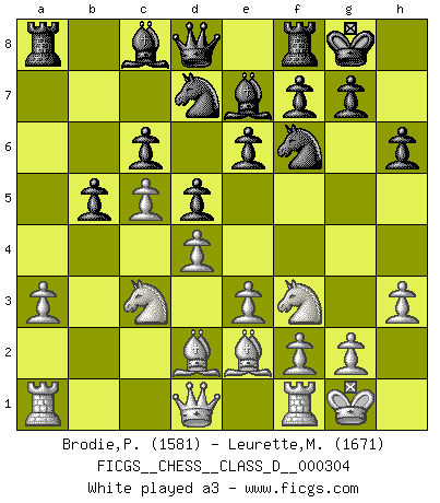 Last move : 0-1 2025 August 2 17:19:40 [Event "FICGS__CHESS__CLASS_D__000304"] [Site "FICGS"] [Date "2025.06.16"] [Round "1"] [White "Brodie,Peter"] [Black "Leurette,Marc-Antoine"] [Result "0-1"] [WhiteElo "1581"] [BlackElo "1671"] 1.d4 d5 2.c4 c6 3.e3 e6 4.c5 Nf6 5.Nc3 Be7 6.Nf3 O-O 7.Be2 Nbd7 8.O-O b5 9.b4 h6 10.h3 a5 11.bxa5 Rxa5 12.Bd2 Ra8 13.a3 Nh7 14.Bd3 Re8 15.e4 Bg5 16.Bxg5 Nxg5 17.e5 Nxf3+ 18.Qxf3 Nf8 19.Qd1 Re7 20.a4 Bb7 21.axb5 Rxa1 22.Qxa1 Re8 23.b6 Qg5 24.f4 Qg3 25.Qe1 Qxd3 26.Ne2 Ba6 27.Rf2 Ng6 28.Qc3 Qd1+ 29.Kh2 Bxe2 30.Rxe2 Qxe2 31.Qf3 Qd2 0-1 Follow this game move after move (download)Fischer is under obligation to nobody. (Joseph Platz) Schachspieler können ausgezeichnet Varianten am Schachbrett berechnen, aber nicht im realen Leben. Zu stark ist der Individualismus im Schach ausgeprägt, und für viele ist ein kleiner momentaner persönlicher Vorteil wichtiger als ein weit größerer Vorteil von morgen. (Anatoly Karpov) Antes de los Finales, los dioses han colocado el Juego Medio. (Siegbert Tarrasch) Mon pion favori sur ma case favorite ! Bronstein en parlant d'un coup de pion en h5 quand il avait les Noirs. In my experience, there's no such thing as luck. (Obi-Wan Kenobi in Star Wars ep.4)