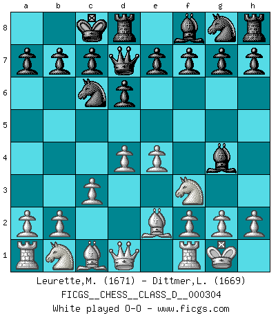 Last move : 1-0 2025 July 28 7:13:22 [Event "FICGS__CHESS__CLASS_D__000304"] [Site "FICGS"] [Date "2025.06.16"] [Round "1"] [White "Leurette,Marc-Antoine"] [Black "Dittmer,Lutz"] [Result "1-0"] [WhiteElo "1671"] [BlackElo "1669"] 1.e4 Nc6 2.d4 d6 3.Nf3 Bg4 4.Be2 Qd7 5.c3 O-O-O 6.O-O e5 7.d5 Nce7 8.Nbd2 1-0 This chess game has been lost on time (started : 2025.06.16 12:6:11) Follow this game move after move (download)In life, as in Chess, one's own Pawns block one's way. A man's very wealth, ease, leisure, children, books, which should help him to win, more often checkmate him. (Charles Buxton) Unter Putin wird alles Geld aus Russland wie von einem Staubsauger nach Moskau umgeleitet, das ist wie ein schwarzes Loch. (Garry Kasparov) Para mi, el Ajedrez es la vida y cada partida es como una nueva vida. Todo jugador de Ajedrez suele vivir muchas vidas durante su vida. (Eduard Gufeld) Tous ces prétendus hommes politiques sont les pions, les Cavaliers, les Tours ou les Fous d'une partie d'échecs qui se jouera tant qu'un hasard ne renversera pas l'échiquier. (Honoré de Balzac) I just play for fun. (Anna Kournikova)