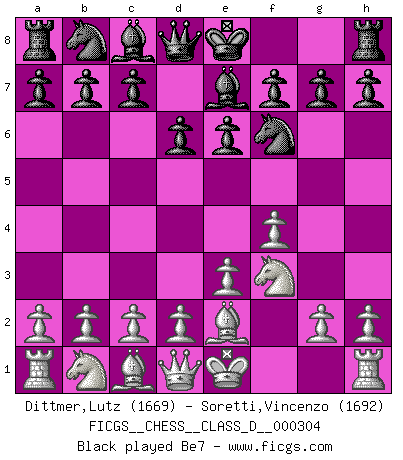 Last move : 0-1 2025 July 31 18:15:56 [Event "FICGS__CHESS__CLASS_D__000304"] [Site "FICGS"] [Date "2025.06.16"] [Round "1"] [White "Dittmer,Lutz"] [Black "Soretti,Vincenzo"] [Result "0-1"] [WhiteElo "1669"] [BlackElo "1692"] 1.f4 Nf6 2.Nf3 d6 3.e3 e6 4.Be2 Be7 5.O-O O-O 6.b3 Nc6 7.Bb2 b6 0-1 This chess game has been lost on time (started : 2025.06.16 12:6:11) Follow this game move after move (download)It's just you and your opponent at the board and you're trying to prove something. (Bobby Fischer) Ich war schon mal beim Dopingtest. Da musste ich Urin abgeben, während Dritte zusahen. (Elisabeth Pähtz) El Ajedrez es una guerra en un tablero. El objetivo es aplastar la mente del oponente. (Bobby Fischer) Il s'avisa de me proposer d'apprendre les échecs qu'il jouait un peu... me voilà forcené des échecs. J'achète un échiquier, je m'enferme dans ma chambre, j'y passe des jours et des nuits à vouloir apprendre par cur toutes les parties. (Jean-Jacques Rousseau, Confessions) A government big enough to give you everything you want is strong enough to take everything you have. (Thomas Jefferson)