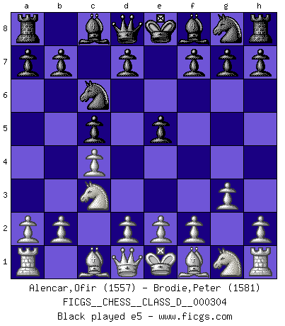 Last move : 0-1 2025 September 12 2:58:24 [Event "FICGS__CHESS__CLASS_D__000304"] [Site "FICGS"] [Date "2025.06.16"] [Round "1"] [White "Alencar,Ofir"] [Black "Brodie,Peter"] [Result "0-1"] [WhiteElo "1557"] [BlackElo "1581"] 1.c4 c5 2.Nc3 Nc6 3.g3 e5 4.Bg2 Nf6 5.Nd5 Be7 6.Nxe7 Nxe7 7.Nh3 O-O 8.d3 d6 9.Bg5 Nd7 10.Bxe7 Qxe7 0-1 This chess game has been lost on time (started : 2025.06.16 12:6:11) Follow this game move after move (download)The Pin is mightier than the sword. (Fred Reinfeld) Ich tröste mich mit dem Vergnügen, daß Schachfans, Zuschauer und Leser glücklich sind, wenn ein Großmeister etwas riskiert, statt nur Klötzchen zu schieben. (Mikhail Nekhemyevich Tal) El Ajedrez, como cualquier otra actividad creativa, puede existir solo a través de méritos combinados de aquellos que tienen talento creativo y de aquellos que tienen la habilidad de organizar un trabajo creativo. (Mikhail Botvinnik) Le pion, dans sa simplicité, marche droit devant lui, mais lorsqu'il prend, il le fait obliquement? Ainsi l'homme, tant qu'il reste pauvre, marche dans la droiture et vit honnêtement, mais lorsqu'il recherche les honneurs, il flatte, se parjure et, par les voies obliques, cherche une position supérieure sur l'échiquier du monde. (Jean de Galles) I'm extremely disappointed. I send you out for exciting, new designer drugs, you come back with tomato sauce. (Gregory House, House M.D.)
