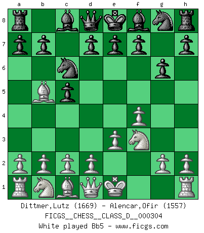 Last move : 1-0 2025 August 22 2:52:9 [Event "FICGS__CHESS__CLASS_D__000304"] [Site "FICGS"] [Date "2025.06.16"] [Round "1"] [White "Dittmer,Lutz"] [Black "Alencar,Ofir"] [Result "1-0"] [WhiteElo "1669"] [BlackElo "1557"] 1.f4 c5 2.Nf3 Nc6 3.e3 g6 4.Bb5 a6 5.O-O 1-0 This chess game has been lost on time (started : 2025.06.16 12:6:11) Follow this game move after move (download)Discovered check is the dive bomber of the Chessboard. (Reuben Fine) Obwohl ich alt bin, darf mir niemand den Finger in den Mund stecken, sonst beisse ich. (Wilhelm Steinitz) El Ajedrez hace al hombre ser mas sabio y ver mas claro. (Vladimir Putin) Les Cavaliers se révèlent fort utiles dans les positions fermées. D'habitude, les Fous sont un peu plus forts que les Cavaliers dans les positions ouvertes. Qu'on le veuille ou non, il restera toujours des exceptions ! I feel so... helpless. (C-3PO in Star Wars ep.3)