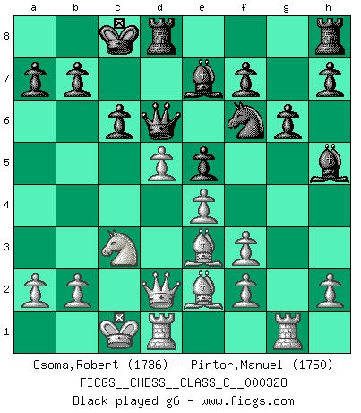 Last move : 1-0 2025 September 15 22:58:57 [Event "FICGS__CHESS__CLASS_C__000328"] [Site "FICGS"] [Date "2025.06.16"] [Round "1"] [White "Csoma,Robert"] [Black "Pintor,Manuel"] [Result "1-0"] [WhiteElo "1736"] [BlackElo "1750"] 1.Nf3 Nc6 2.d4 d5 3.c4 dxc4 4.e4 Bg4 5.d5 Ne5 6.Be2 Nxf3+ 7.gxf3 Bh5 8.Bxc4 Qd6 9.Nc3 c6 10.Be3 Nf6 11.Be2 e5 12.Qd2 Be7 13.Rg1 O-O-O 14.O-O-O g6 15.Qc2 Kb8 16.Qa4 c5 17.Nb5 Qb6 18.Nc3 Rc8 19.Rd2 Qb4 20.d6 Bd8 21.Kb1 a6 22.Qxb4 cxb4 23.Nd5 Nxd5 24.Rxd5 f6 25.Bd2 a5 26.Re1 Rc6 27.f4 Bxe2 28.Rxe2 exf4 29.Bxf4 g5 30.Bg3 b6 31.e5 f5 32.f4 g4 33.e6 Rc5 34.Rxc5 bxc5 35.e7 Bxe7 36.dxe7 Re8 37.Re5 Kb7 38.Bh4 Kc6 39.Rxf5 Kd6 40.Rf8 Rxe7 41.Bxe7+ Kxe7 42.Rh8 1-0 Follow this game move after move (download)I guess a certain amount of temperament is expected of Chess geniuses. (Ron Gross) Wenn Du einsam bist, wenn Du Dich in der Welt wie ein Fremder fühlst, spiele Schach. Das wird Deinen Geist erheben und Dein Ratgeber im Kampf sein. (Aristoteles) La enorme capacidad mental, en la que sin ella no puede un jugador de Ajedrez existir, es demasiado requerida por el Ajedrez al grado de que nunca podrá liberar su mente de este juego. (Albert Einstein) La vérité est comme le meilleur coup aux échecs : elle existe, mais il faut la chercher. (Arturo Perez-Reverte) When you've done things right people won't know you've done anything at all. (Futurama)