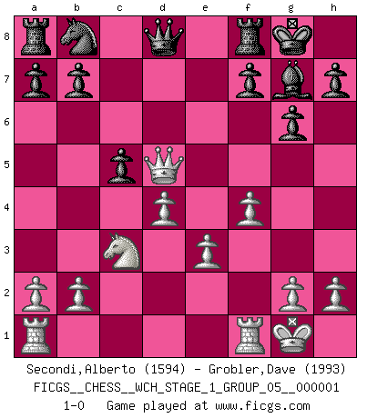 Last move : 1-0 2006 September 19 19:58:19 [Event "FICGS__CHESS__WCH_STAGE_1_GROUP_05__000001"] [Site "FICGS"] [Date "2006.07.01"] [Round "1"] [White "Secondi,Alberto"] [Black "Grobler,Dave"] [Result "1-0"] [WhiteElo "1594"] [BlackElo "1993"] 1.d4 Nf6 2.c4 g6 3.Nc3 d5 4.Bg5 Ne4 5.Nf3 Nxg5 6.Nxg5 e6 7.e3 Qxg5 8.f4 Qd8 9.cxd5 exd5 10.Be2 Bg7 11.O-O O-O 12.Bf3 Be6 13.Qb3 c5 14.Bxd5 Bxd5 15.Qxd5 1-0 This chess game has been lost on time (started : 2006.07.01 16:5:54) King's Indian defense, 3.Nc3 Kingside Castling by player White (move 11) Kingside Castling by player Black (move 11) Player White won this chess game. Follow this game move after move (download)It began to feel as though you were playing against Chess itself. - On playing against Robert Fischer. (Walter Shipman) Wie, soll nun auch die Opposition abgeschafft werden? Ja, es tut mir leid, Ihnen diesen Schmerz nicht ersparen zu können. (Aaron Nimzowitsch) Cuando tu casa esta en llamas, no puedes ser molestado por tus vecinos. O, como decinos en Ajedrez, si tu Rey esta bajo ataque, no te preocupa perder un Peón del lado de la Reina. (Gary Kasparov) La solitude du joueur d'Echecs à l'approche du mat est semblable à celle du condamné. (Francis Szpiner) A mistake is only a mistake if you let it happen twice. Otherwise it is a learning experience. (Daniel Parmet)