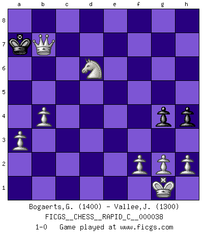 Last move : 1-0 2007 October 30 13:53:43 [Event "FICGS__CHESS__RAPID_C__000038"] [Site "FICGS"] [Date "2007.10.03"] [Round "1"] [White "Bogaerts,Geert-Jan"] [Black "Vallee,Jean-Pierre"] [Result "1-0"] [WhiteElo "1400"] [BlackElo "1300"] 1.e4 e5 2.Nf3 Nc6 3.Bb5 Bc5 4.O-O Nf6 5.Bxc6 bxc6 6.c3 d6 7.d4 exd4 8.cxd4 Bg4 9.dxc5 d5 10.exd5 cxd5 11.Re1+ Ne4 12.Nc3 Qe7 13.Qxd5 Nxc3 14.Rxe7+ Kxe7 15.Qe5+ Kf8 16.Qxc3 Re8 17.Bf4 c6 18.Bd6+ Kg8 19.Re1 Rxe1+ 20.Qxe1 g6 21.Qe8+ Kg7 22.Be5+ f6 23.Bxf6+ Kxf6 24.Qxh8+ Ke6 25.Qc8+ Kd5 26.Qxg4 Kxc5 27.Qd4+ Kb5 28.Qxa7 h5 29.Nd2 c5 30.a3 c4 31.Qc7 g5 32.b4 h4 33.Qxc4+ Kb6 34.Qc5+ Kb7 35.Nc4 g4 36.Nd6+ Kb8 37.Qc6 Ka7 38.Qb7+ 1-0 Ruy Lopez : Classical (Cordel) defense Kingside Castling by player White (move 4) Player White won this chess game. Follow this game move after move (download)A passed Pawn increases in strength as the number of pieces on the board diminishes. (Capablanca) Ich bin stolz ein Bulgare zu sein. (Veselin Topalov) Una de estas pequeñas movidas modestas pudieran ser mas molestas a tu oponente que la amenaza mas grande. (Siegbert Tarrasch) Aucun coup ne doit être joué sans but. (Pedro Damiano) Whenever people agree with me, I always feel I must be wrong. (Oscar Wilde)
