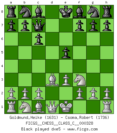 Last move : 0-1 2025 December 21 18:6:7 [Event "FICGS__CHESS__CLASS_C__000328"] [Site "FICGS"] [Date "2025.06.16"] [Round "1"] [White "Goldmund,Heike"] [Black "Csoma,Robert"] [Result "0-1"] [WhiteElo "1631"] [BlackElo "1736"] 1.d4 d6 2.Nf3 c6 3.e3 Qc7 4.Bd3 e5 5.dxe5 dxe5 6.b3 Nf6 7.O-O Be7 8.Bb2 Bd6 9.Nc3 Bg4 10.Ne4 Nxe4 11.Bxe4 f5 12.Bd3 e4 13.Bc4 exf3 14.gxf3 Bh3 15.f4 Bxf1 16.Kxf1 Nd7 17.Bxg7 O-O-O 18.Bxh8 Rxh8 19.Be6 Rf8 20.Qd3 Kb8 21.Rd1 Bxf4 22.Qxd7 Bxh2 23.Qxc7+ Bxc7 24.Ke2 f4 25.f3 fxe3 26.Bg4 Bf4 27.Rd7 h6 28.Rh7 Rd8 29.Rd7 Rxd7 30.Bxd7 Kc7 31.Bf5 Kd6 32.Bc8 b6 33.c4 Ke5 34.Bb7 c5 35.Be4 h5 36.Kf1 h4 37.Kg2 h3+ 38.Kxh3 e2 0-1 Follow this game move after move (download)For me, Chess is life and every game is like a new life. Every Chess player gets to live many lives in one lifetime. (Eduard Gufeld) Das Schachspiel ist ein See, in welchem eine Mücke baden und ein Elefant ertrinken kann. (Emanuel Lasker) El juego del Ajedrez no es solamente una diversión quieta; algunas cualidades muy valuables de la mente se pueden adquirir y cultivar con el, como convertirlos en habitos disponibles para toda ocasión; ya que la vida es algo así como el Ajedrez. (Benjamin Franklin) C'est une question de caractère, Beaucoup de gens perdent leur motivation très vite. D'autres, ils sont rares, peuvent la conserver très longtemps. J'aime les échecs, encore aujourd'hui je suis heureux d'analyser des parties. J'aime toujours gagner, je déteste encore perdre. Bien jouer est important pour mon intégrité intellectuelle et morale. Et puis les échecs vivent en ce moment une période historique grâce à Internet. Ils se développent dans les systèmes éducatifs à travers le monde. Ils sortent de leur ghetto, et c'est mon rôle de mener à bien cette révolution. (Gary Kasparov) They say poker is a zero-sum game. It must be, because every time I play my sum ends up zero. (Max Shapiro)