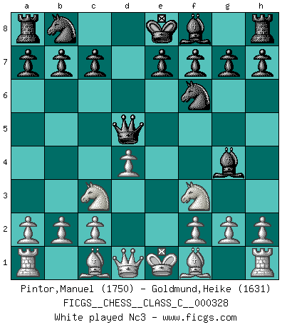 Last move : 1-0 2025 August 7 12:37:5 [Event "FICGS__CHESS__CLASS_C__000328"] [Site "FICGS"] [Date "2025.06.16"] [Round "1"] [White "Pintor,Manuel"] [Black "Goldmund,Heike"] [Result "1-0"] [WhiteElo "1750"] [BlackElo "1631"] 1.e4 d5 2.exd5 Qxd5 3.d4 Nf6 4.Nf3 Bg4 5.Nc3 Qd8 6.Be2 e6 7.O-O Bd6 8.Ne5 O-O 9.Nxg4 Nbd7 10.Bg5 h6 11.Bh4 c6 12.Ne4 Be7 13.Ngxf6+ Nxf6 14.Nxf6+ Bxf6 15.Bxf6 Qxf6 16.c3 Rad8 17.Bd3 b6 18.Qg4 Rd5 19.f4 e5 20.fxe5 Qe7 21.Rf5 b5 22.Qe4 g6 23.Rf6 Kh7 24.Raf1 Kg7 25.Qh4 a6 26.Rxg6+ fxg6 27.Qxe7+ 1-0 Follow this game move after move (download)A thorough understanding of the typical mating continuations makes the most complicated sacrificial combinations leading up to them not only not difficult, but almost a matter of course. (Siegbert Tarrasch) Zum Sieg gelangt man nicht, wenn man gut, sondern nur wenn man besser spielt (Savielly Grigorievitsch Tartakower) Un jugador que trata de regresar una movida en el Ajedrez es un futuro carterista. (Richard Fenton) Votre seul travail dans les ouvertures est d'obtenir un milieu de partie jouable. (Lajos Portish) When you stop learning you start dying. (M. Scott Adams)
