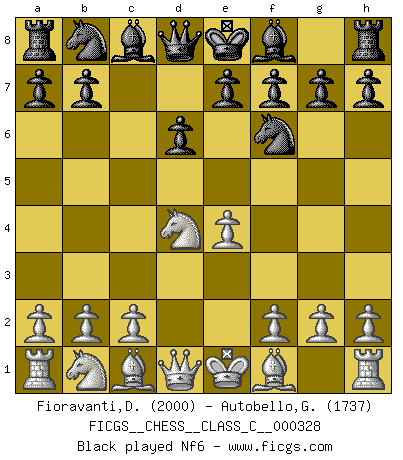Last move : 0-1 2025 October 23 17:11:1 [Event "FICGS__CHESS__CLASS_C__000328"] [Site "FICGS"] [Date "2025.06.16"] [Round "1"] [White "Fioravanti,Diego"] [Black "Autobello,Giovanni"] [Result "0-1"] [WhiteElo "2000"] [BlackElo "1737"] 1.e4 c5 2.Nf3 d6 3.d4 cxd4 4.Nxd4 Nf6 5.Nc3 a6 6.Be2 Nc6 7.a4 e6 8.O-O Be7 9.Be3 O-O 10.f4 Qc7 11.Nxc6 bxc6 0-1 This chess game has been lost on time (started : 2025.06.16 12:6:35) Follow this game move after move (download)If a ruler does not understand Chess, how can he rule over a kingdom ? (King Khusros II) Der vorletzte Fehler gewinnt. (Savielly Grigorievitsch Tartakower) Aquel que toma al Peón de Caballo de la Reina, se pasará la noche a dormir en la calle. (Anónimo) D'abord les bases : Jouez et étudiez, puis étudiez et jouez, ensuite jouez et étudiez, puis étudiez et jouez. Deuxièmement : Donnez toujours le meilleur de vous-même ! (Ken Smith) The problem with troubleshooting is that trouble shoots back. (Anonymous)