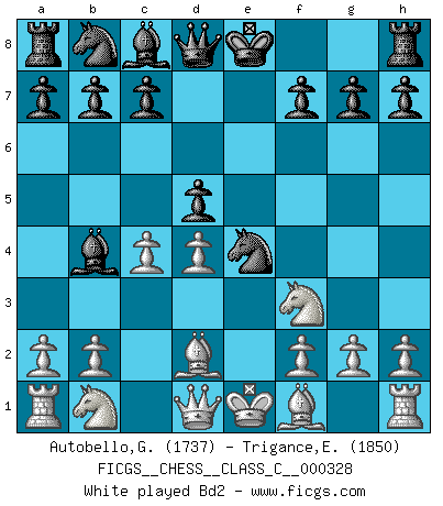 Last move : 1-0 2025 November 12 7:37:48 [Event "FICGS__CHESS__CLASS_C__000328"] [Site "FICGS"] [Date "2025.06.16"] [Round "1"] [White "Autobello,Giovanni"] [Black "Trigance,Emile"] [Result "1-0"] [WhiteElo "1737"] [BlackElo "1850"] 1.e4 e5 2.Nf3 Nf6 3.Nxe5 d6 4.Nf3 Nxe4 5.d4 d5 6.c4 Bb4+ 7.Bd2 Nxd2 8.Nbxd2 O-O 9.Be2 Re8 10.O-O c6 11.a3 Bf8 12.Rc1 Be6 13.b4 Nd7 14.h3 dxc4 15.Nxc4 1-0 This chess game has been lost on time (started : 2025.06.16 12:6:35) Follow this game move after move (download)An attack on the wing should be met by play in the center. (Nimzovitch) Früher wurde jeder komplizierte Zug, jedes interessante Opfer mit großem Beifall und Enthusiasmus aufgenommen. Heute schaltet man einfach seinen Fritz an, und man kann sehen, was los ist, ob der Zug geht oder nicht. (Vladimir Kramnik) El Rey es una pieza de pelea. ¡Usenlo!. (Wilhelm Steinitz) Un journaliste : 'Vous préférez avoir une dame de plus sur l'échiquier ou au lit ?' Boris Spassky : 'Ca dépend de la position.' Somehow our devils are never quite what we expect when we meet them face to face. (Nelson DeMille)