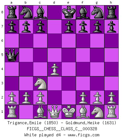 Last move : 0-1 2025 August 8 2:20:47 [Event "FICGS__CHESS__CLASS_C__000328"] [Site "FICGS"] [Date "2025.06.16"] [Round "1"] [White "Trigance,Emile"] [Black "Goldmund,Heike"] [Result "0-1"] [WhiteElo "1850"] [BlackElo "1631"] 1.e4 d5 2.exd5 Qxd5 3.Nc3 Qa5 4.d4 Nf6 5.h3 Bf5 0-1 This chess game has been lost on time (started : 2025.06.16 12:6:35) Follow this game move after move (download)Chess, like love, is infectious at any age. (Flohr) Mein erstes Ziel war nicht, die Partie zu gewinnen, sondern eine Figur zu opfern. -- der junge (Wilhelm Steinitz) El ganar no lo es todo... pero el perder es nada. (Mednis) La vérité est comme le meilleur coup aux échecs : elle existe, mais il faut la chercher. (Arturo Perez-Reverte) O divine art of subtlety and secrecy! Through you we learn to be invisible, through you inaudible and hence we can hold the enemy's fate in our hands. (Sun Tzu)