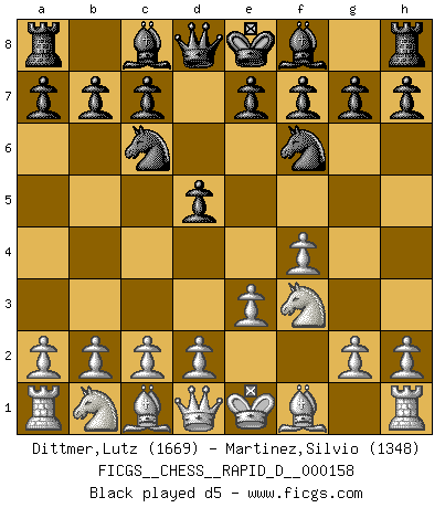 Last move : 0-1 2025 August 3 12:28:3 [Event "FICGS__CHESS__RAPID_D__000158"] [Site "FICGS"] [Date "2025.06.16"] [Round "1"] [White "Dittmer,Lutz"] [Black "Martinez,Silvio"] [Result "0-1"] [WhiteElo "1669"] [BlackElo "1348"] 1.f4 Nf6 2.Nf3 Nc6 3.e3 d5 4.Bb5 a6 5.Bxc6+ bxc6 6.O-O e6 0-1 Follow this game move after move (download)Chess is ruthless: you've got to be prepared to kill people. (Nigel Short) Wenn du nicht weißt was du tun sollst, warte bis dein Gegner eine Idee hat. Sie wird sicher schlecht sein. (Siegbert Tarrasch) No hay precio que no valga la pena por la cabellera del Rey enemigo. (Koblentz) Aux échecs, l'amour-propre est satisfait quand on remporte la victoire, mais il n'y a pas de honte à être battu. (Benjamin Franklin) There is far too much law for those who can afford it and far too little for those who cannot. (Derek Bok)