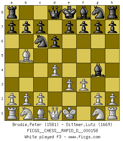 Last move : 1-0 2025 July 27 3:28:43 [Event "FICGS__CHESS__RAPID_D__000158"] [Site "FICGS"] [Date "2025.06.16"] [Round "1"] [White "Brodie,Peter"] [Black "Dittmer,Lutz"] [Result "1-0"] [WhiteElo "1581"] [BlackElo "1669"] 1.d4 Nc6 2.e3 d6 3.Bb5 Bg4 4.f3 Qd7 5.fxg4 O-O-O 6.Nc3 g6 7.Qf3 1-0 This chess game has been lost on time (started : 2025.06.16 12:7:13) Follow this game move after move (download)Alekhine is a poet who creates a work of art out of something that would hardly inspire another man to send home a picture post card. (Max Euwe) Um dein Spiel zu verbessern musst du zuallererst das Endspiel studieren, denn diese kann unabhängig studiert werden. Die Eröffnung und das Mittelspiel müssen immer in Bezug gesetzt werden zum Endspiel. (José Raúl Capablanca) Robert Fischer es la ley hacia si mismo. (Larry Evans) Dieu déplace le joueur, et celui-ci la pièce. Quel Dieu derrière Dieu commence donc la trame ? Arturo Perez-Reverte (prix de littérature policière 1993). In every real man a child is hidden that wants to play. (Friedrich Nietzsche)